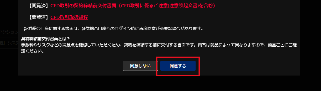 証券総合口座、CFD取引口座の契約締結前交付書面が改訂される際に、書面を確認し内容について同意を行っていただく必要があります。