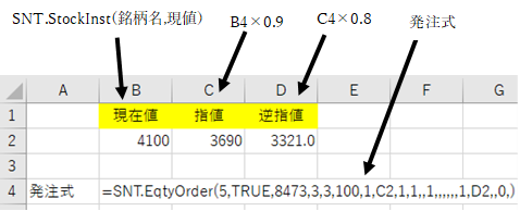 他ツールでは、お客様自身でこれらを計算し、それぞれ入力していく必要がありますが、「ネオトレAPI for Excel」は Excel上で計算した結果が自動で反映されるので、お客様自身で計算する必要がなく、1秒を争う注文に対応することができます。