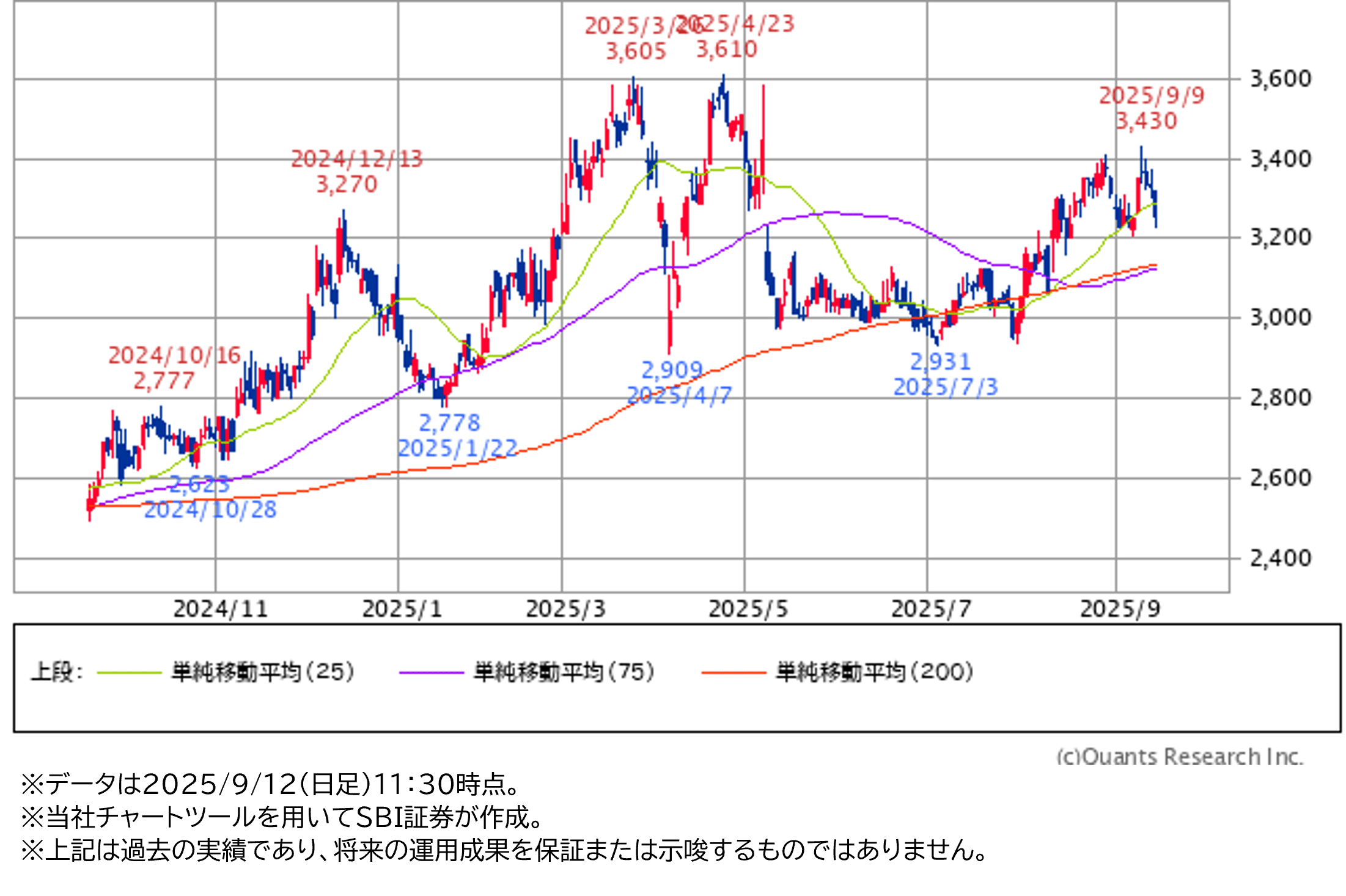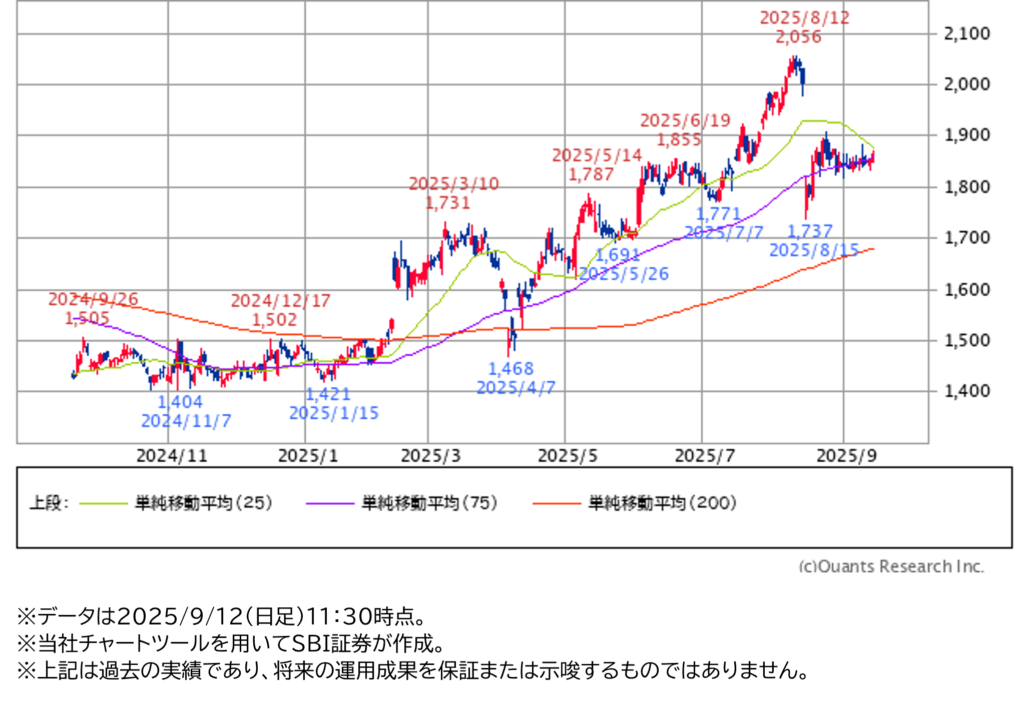 株価は本年8月に国内大手証券会社が、投資判断の引き下げ(「買い」から「中立」)、および目標株価の引き下げ(2,300円から2,100円)等を背景に、売りが広がりました。ただ、引き下げ後の目標株価も9/11(木)時点の株価1,856円とはかい離があります。