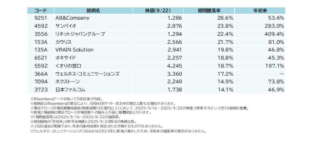 【参考】 9/16(火)~9/22(月)で株価上昇が大きかった東証グロース市場指数構成銘柄