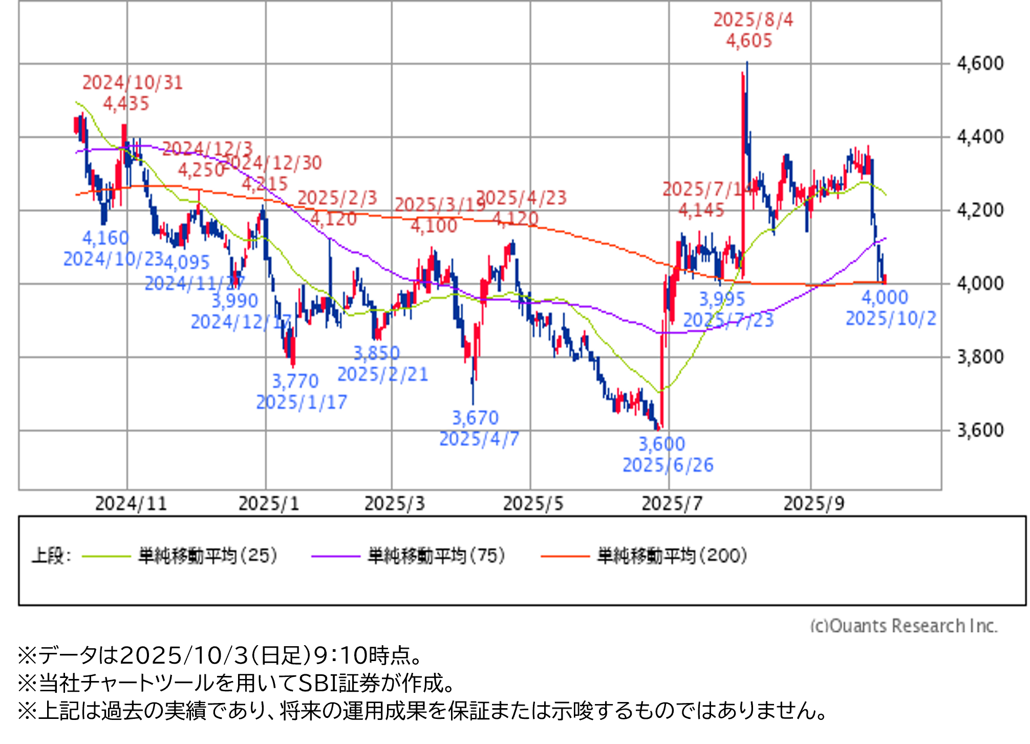インフラ維持管理などテーマ性なども注目され株価は7月以降から上昇基調。10/9(木)時点で年初来高値水準です。さらに、25.6月末時点で受注残高が過去最高水準(1,056億円)に達しており、将来の売上拡大の裏付けとして長期成長性が意識されています。