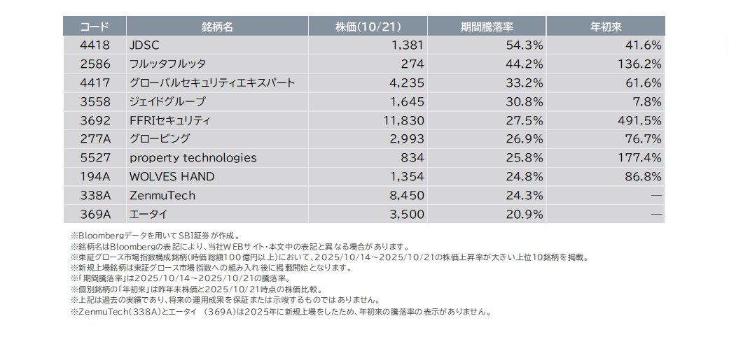 【参考】 10/14(火)~10/21(火)で株価上昇が大きかった東証グロース市場指数構成銘柄