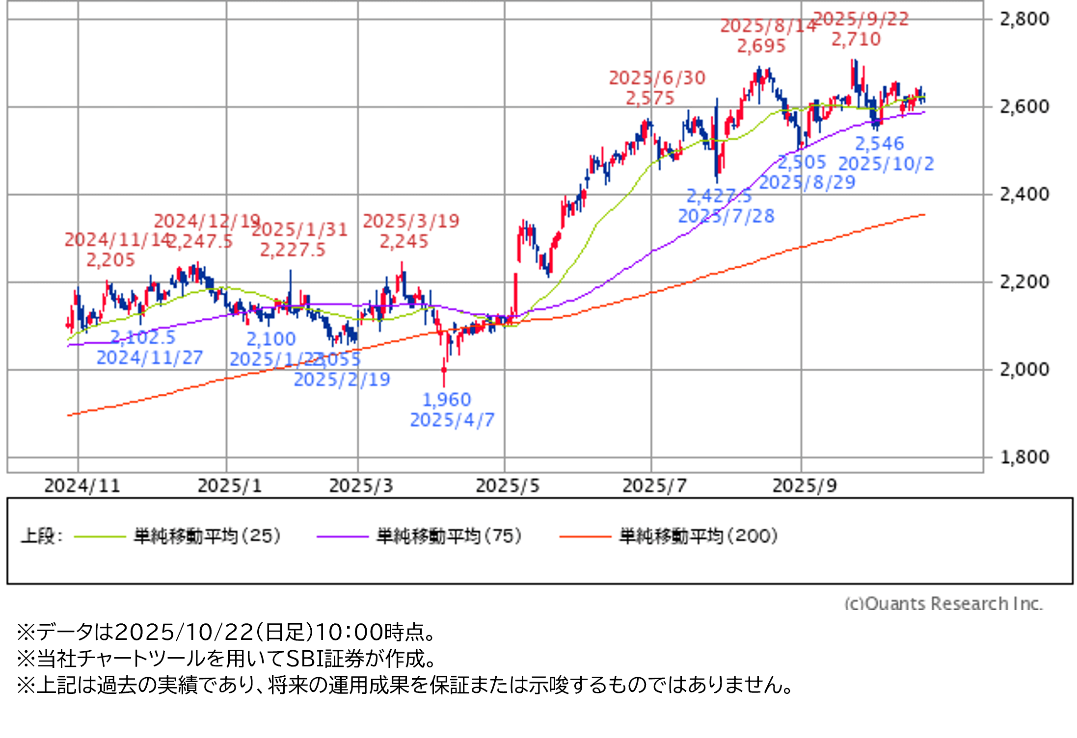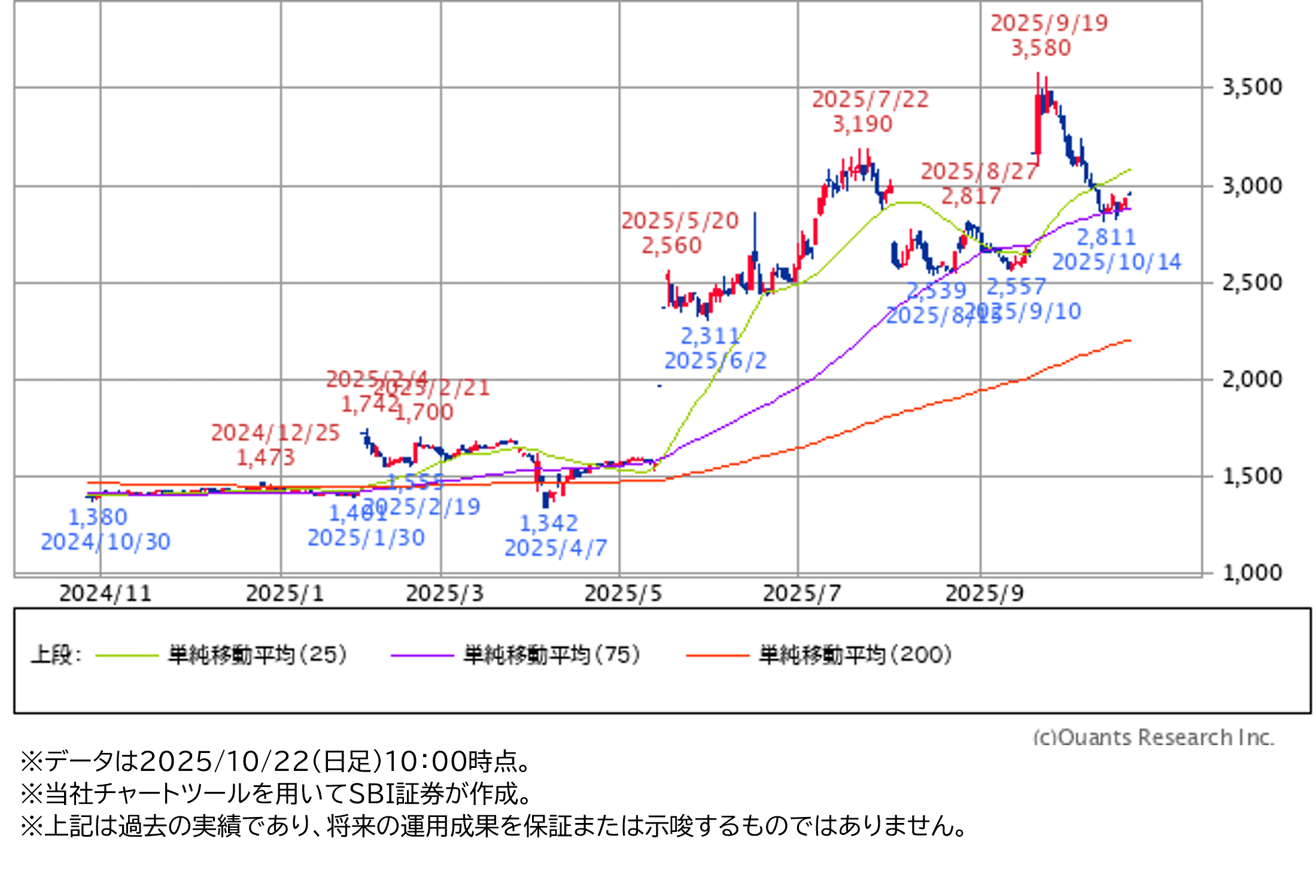 本年9月には、26.3期2Q(25.4-9月期)の業績予想を大幅上方修正。売上高89億円→105億円(前年同期比44%増)、経常利益9.1億円→16億円(前年同期比5.5倍)と引き上げました。発表直後には、上場来高値を更新する場面がありましたが、10/21(火)時点では高値から約▲18%の調整局面にあります。
