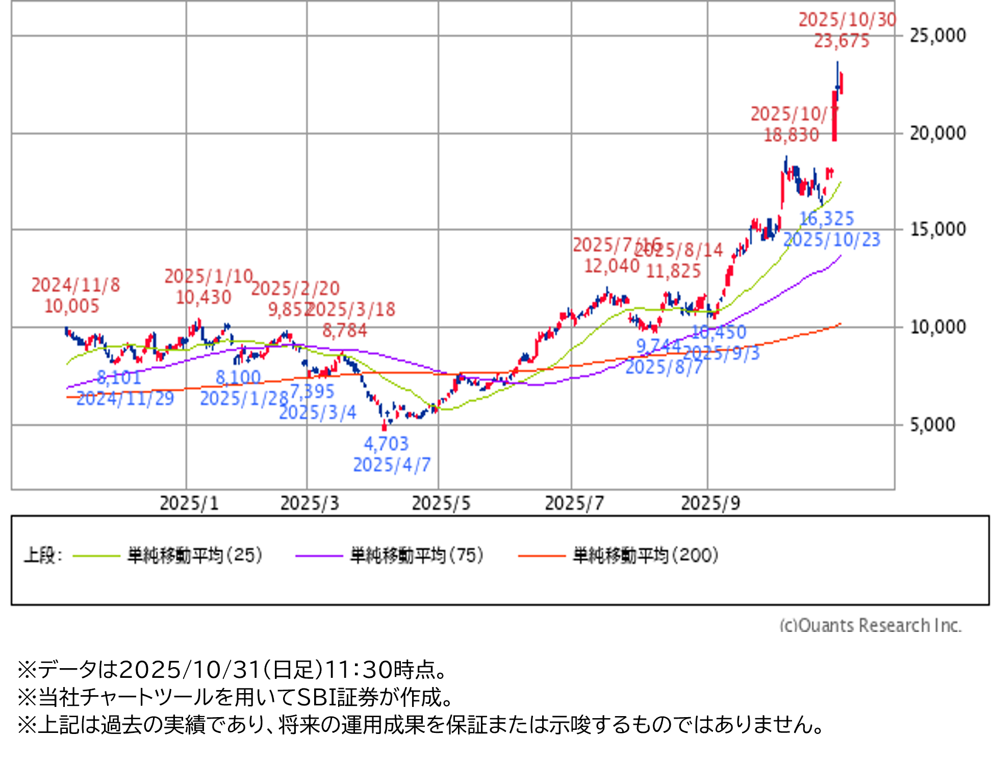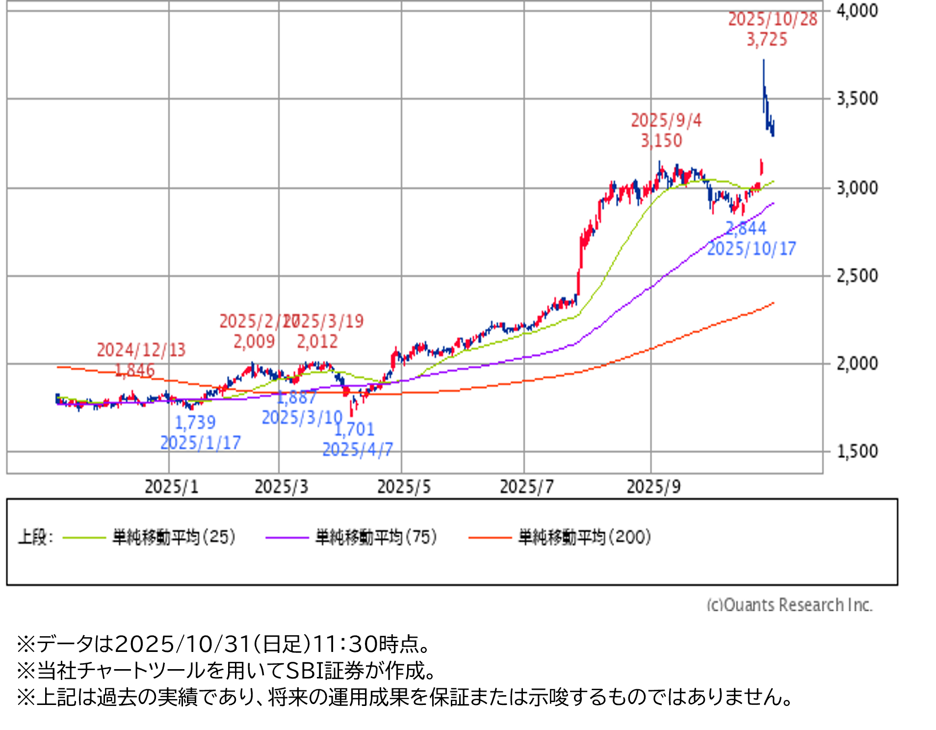 10月28日には半導体・AI関連の一角を占めるアドバンテスト(6857)が業績予想の上方修正および自社株買いを発表。翌29日の取引ではストップ高となり、この日の日経平均株価の急騰(1,088円高)の「立役者」(寄与度が1,077円)になりました。