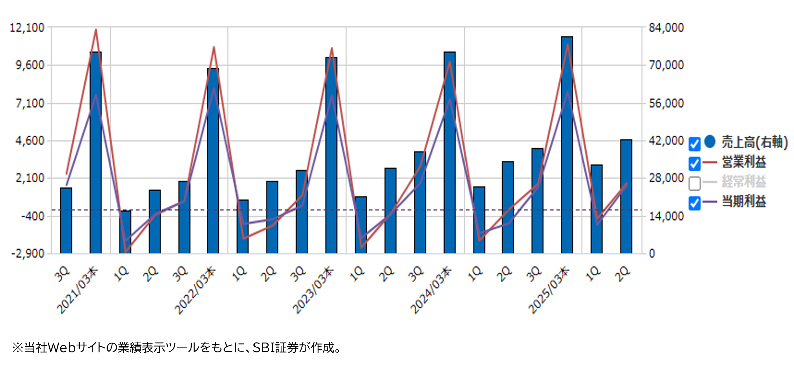 ◎10月28日(火)に発表された26年3月期第2四半期(25年7月~9月)決算でも純利益が1,084億円(同70%増)と好調持続。会社見通しを78億円上回りました。26年3月期上半期(25年4月~9月)の純利益は1,698億円(同144%増)となりました。第2四半期の上振れを背景に、26年3月通期の純利益は2,750億円(前期比70%増)に上方修正されました。