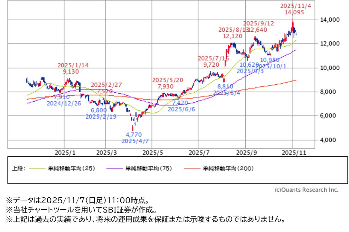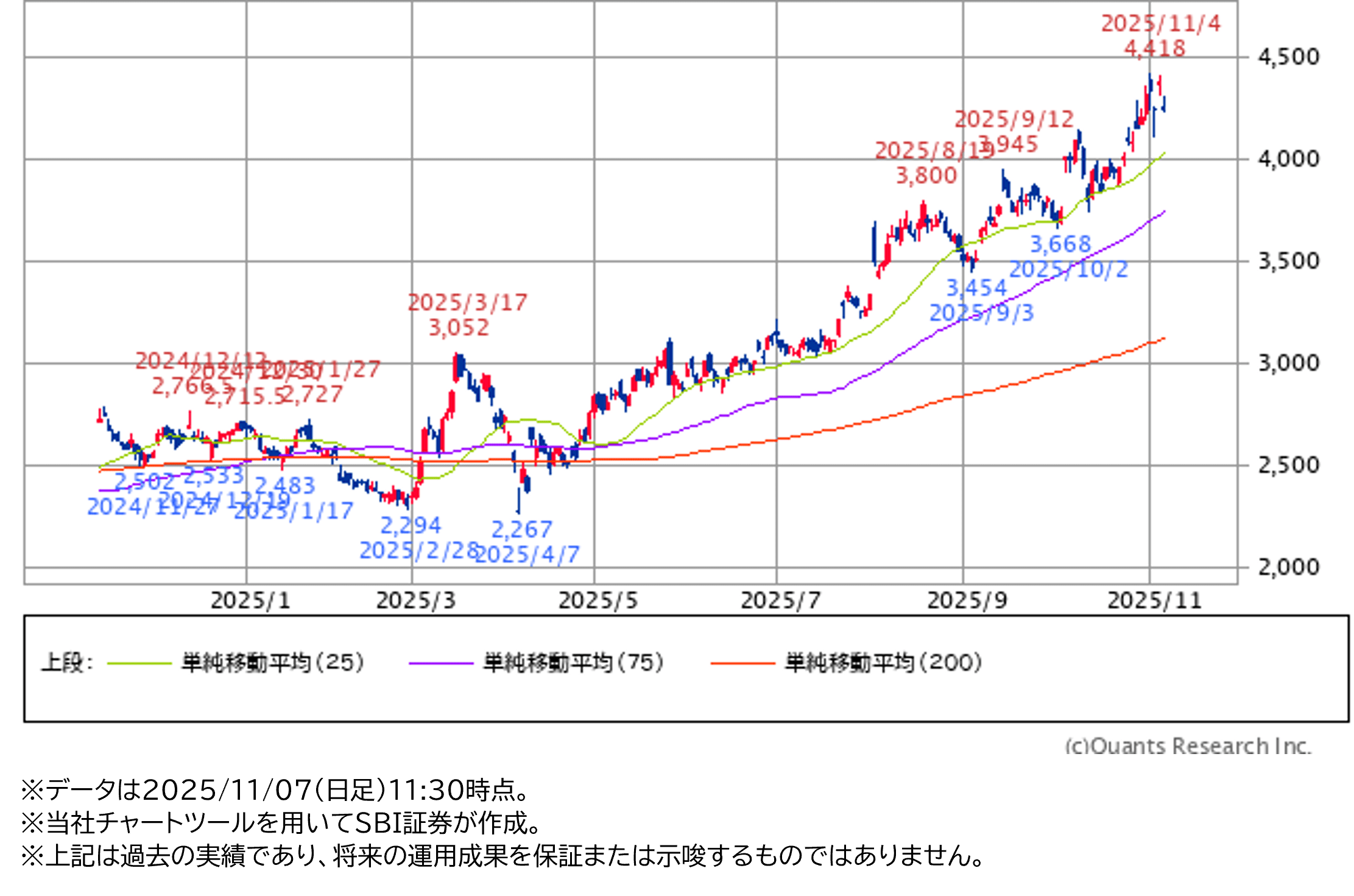 株価は高値更新後に一服。ただ、防衛関連事業の拡大に加え、11月7日付日本経済新聞で報じられたAIサーバー分野での鴻海精密との提携は注目材料。生成AI普及に伴うデータセンター需要の増加も追い風となり、再評価の余地は大きいとみられます。