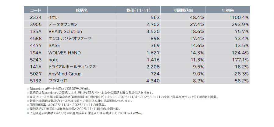 【参考】 11/4(火)~11/11(火)で株価上昇が大きかった東証グロース市場指数構成銘柄