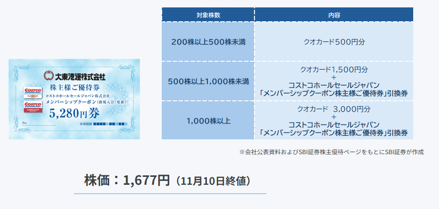 | 10月7日 | 大東港運★ | 9367 | 拡充 | コストコホールセールジャパン「メンバーシップクーポン株主様ご優待券」引換券(500株以上:5,280円相当) | 3月末日 |