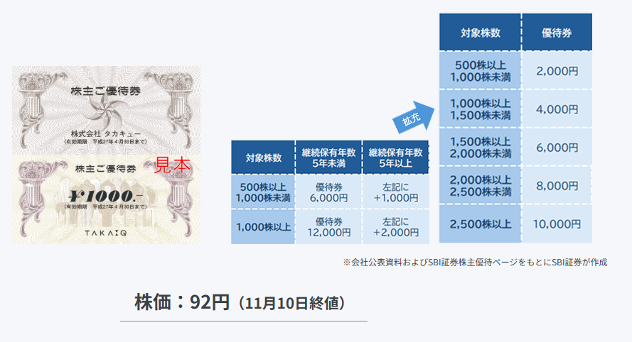 500株以上の保有で「TAKA-Q」をはじめ、グループ店舗で使える優待券がもらえます。