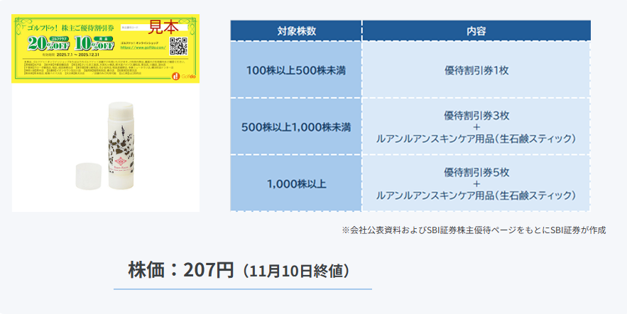 | 10月10日 | ゴルフ・ドゥ★ | 3032 | 拡充 | ルアンルアン スキンケア用品 生せっけんスティック(最低保有株数を実質的に引き下げ) | 3月末日 |