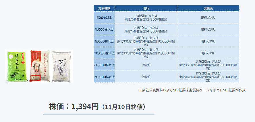 株主優待では保有株数に応じて、お米や東北・北海道の特産品をもらうことができます。