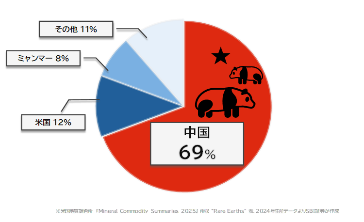 中国は世界のレアアース鉱石生産量の約7割を占める一大生産国です(参考①、米国地質調査所『Mineral Commodity Summaries 2025』所収 “Rare Earths” 表、2024年生産データ)。
