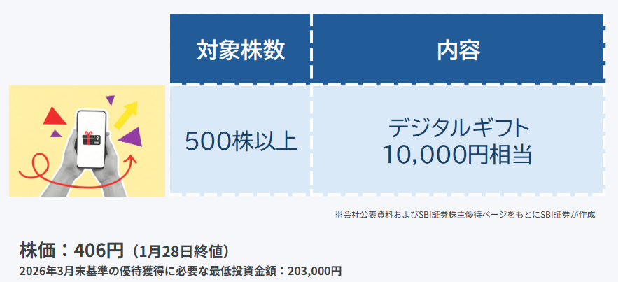 - ※優待獲得に必要な最低投資金額は2026年1月28日終値と優待を獲得するための最低購入株数をかけた金額です。