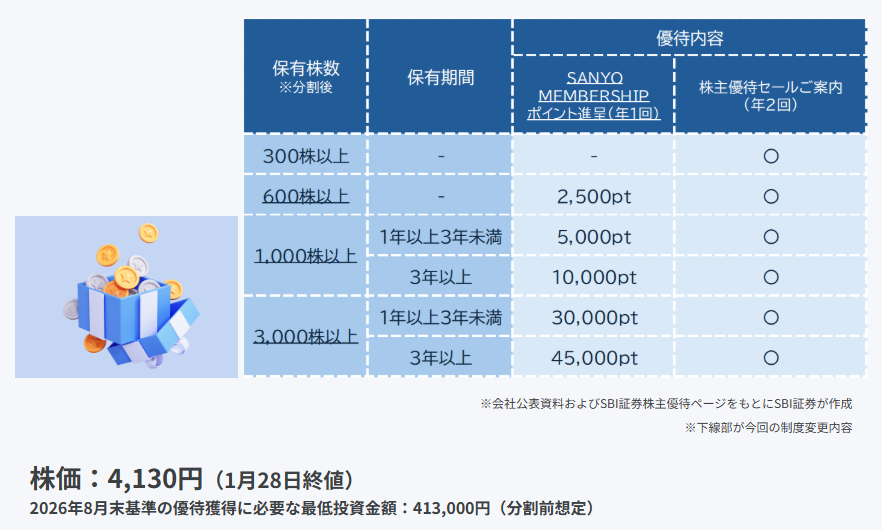 また、「1年以上」「3年以上」の長期保有特典の新設に加え、600株以上では自社商品の購入に利用できるSANYO MEMBERSHIP(SMS)ポイントももらえるようになりました。👚