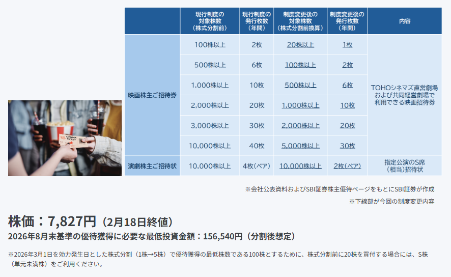 | 1月14日 | 東宝★ | 9602 | 拡充 | ・株式分割に伴い対象区分引き下げ 100株(分割後):TOHOシネマズ直営劇場および共同経営劇場で利用できる映画招待券1枚 |