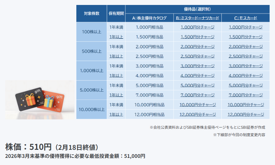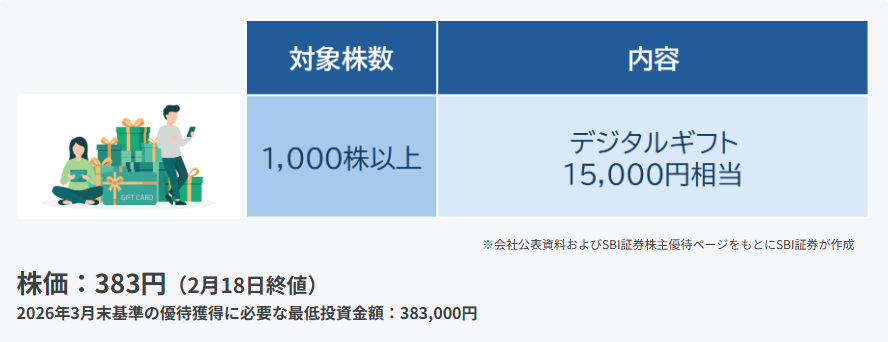 - ※優待獲得に必要な最低投資金額は2026年2月18日終値と優待を獲得するための最低購入株数をかけた金額です。