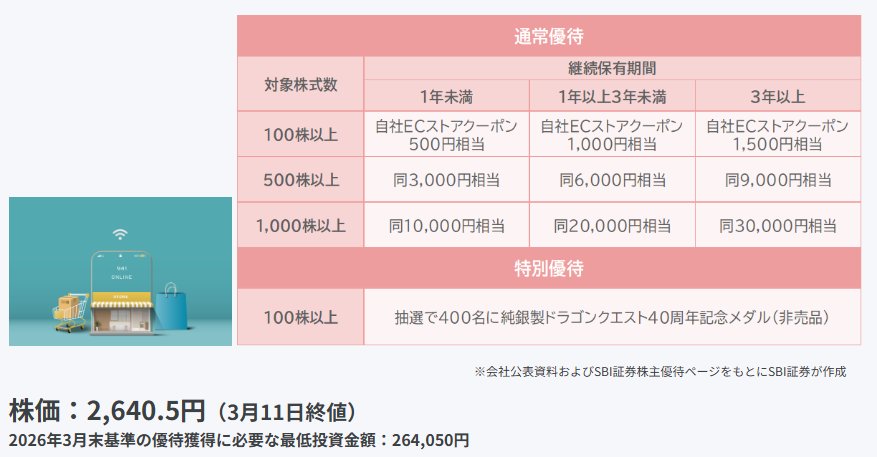 本優待制度は、2026年3月末時点の株主名簿に記載された株主から適用されます。