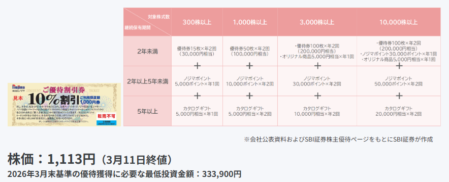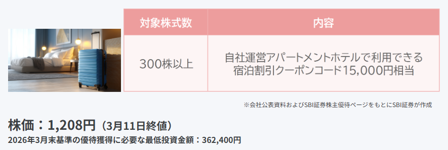 - ※優待獲得に必要な最低投資金額は2026年3月11日終値と優待を獲得するための最低購入株数をかけた金額です。