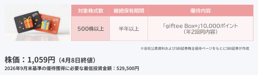 500株以上を半年以上保有することで、年に2回「giftee Box®」10,000ポイントがもらえます🪙