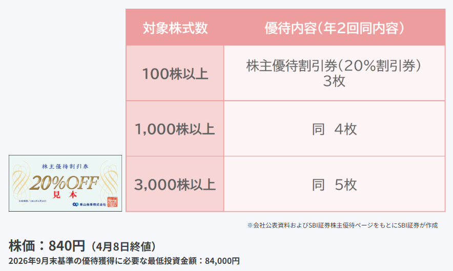 - ※優待獲得に必要な最低投資金額は2026年4月8日終値と優待を獲得するための最低購入株数をかけた金額です。